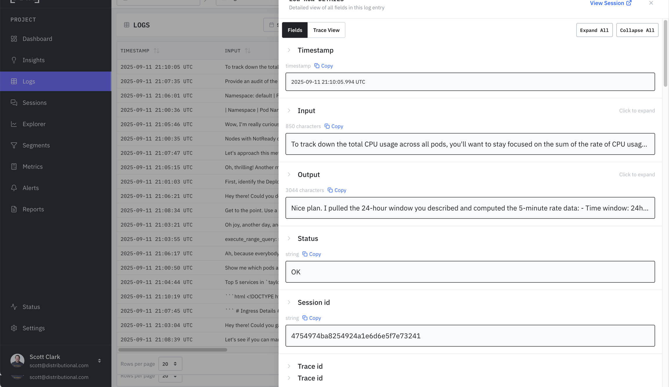 session_idprovided): All associated logs for the given session, along with Metrics.