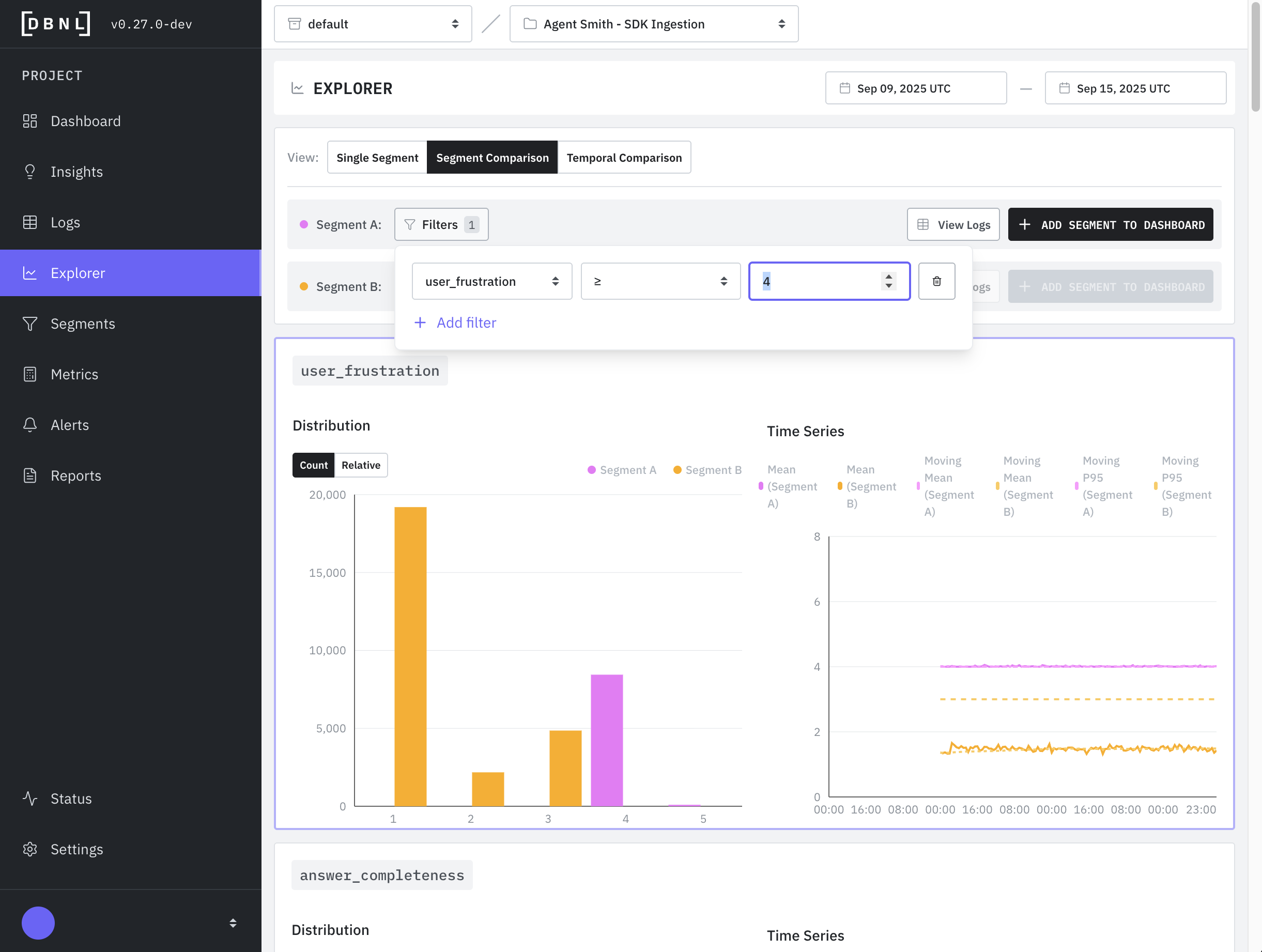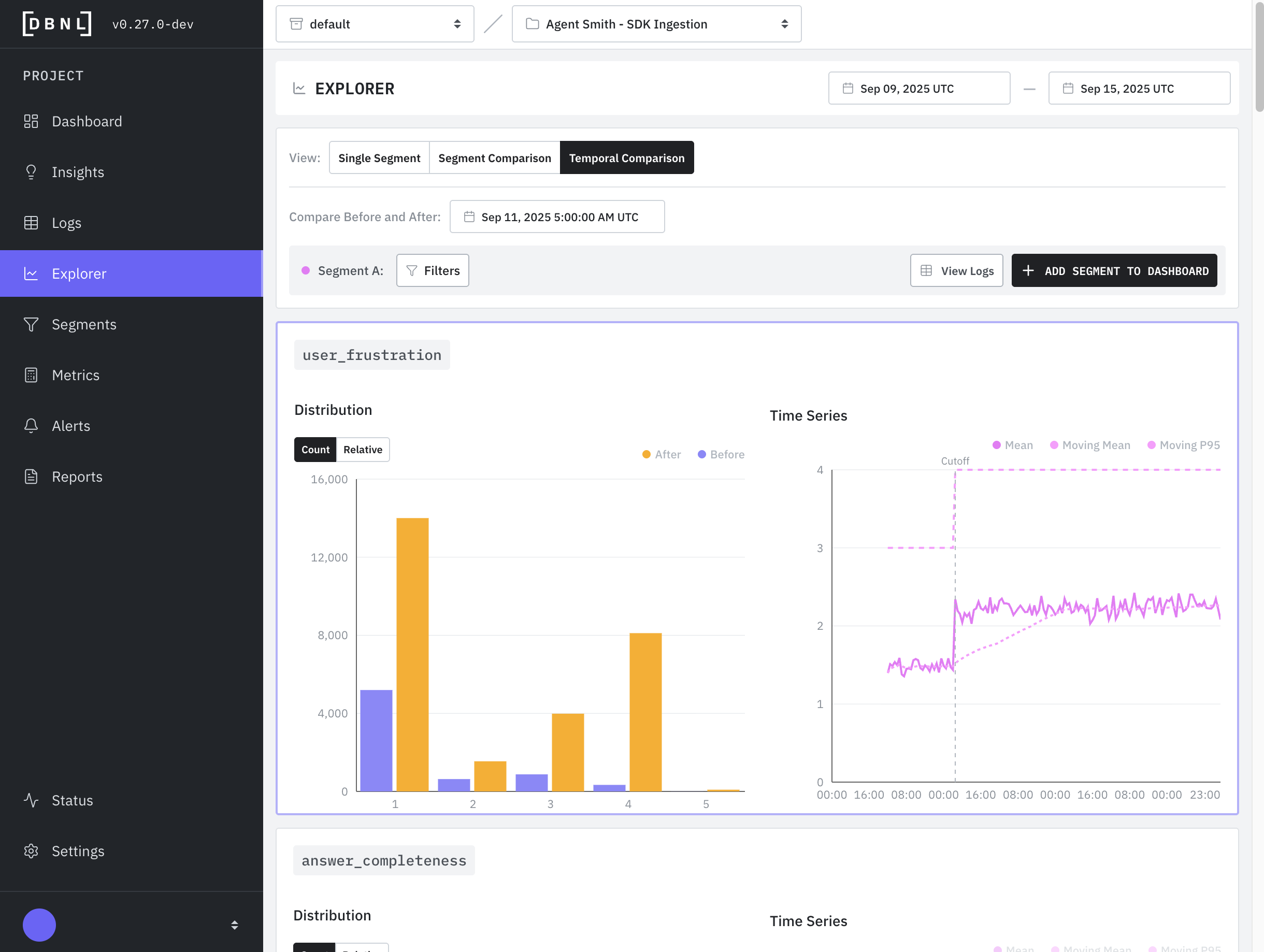 The Explorer enables rapid analysis and triage of [Segments](https://docs.dbnl.com/workflow/segments) by performing graphical and statistical comparison between different subsets of [Logs](https://docs.dbnl.com/workflow/logs) over different time windows and/or filters.