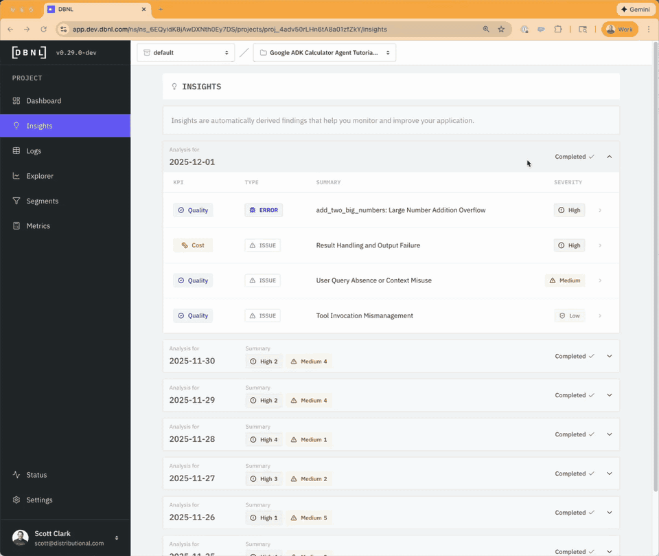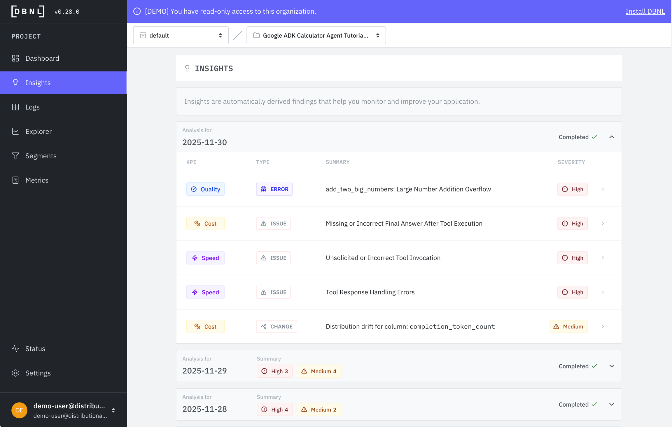 Insights represent signals that the user can triage and refine through the Explorer or inspection of Logs and track as Metrics or Segments. They represent clusters of log data defined by filters on Columns corresponding to unique patterns of behavior. Insights can point to errors, issues, or changes within your agentic application that can be used to inform where and how to improve or fix your agent as part of an Analytics-Driven Data Flywheel. Insights can reveal new metrics to eval or incorporate into reward functions, they can also pinpoint specific segments of data that can be used for focued post-training optimization, whether that be fine tuning, reinforcement learning, hyperparameter optimization, prompt optimization, or any other method.