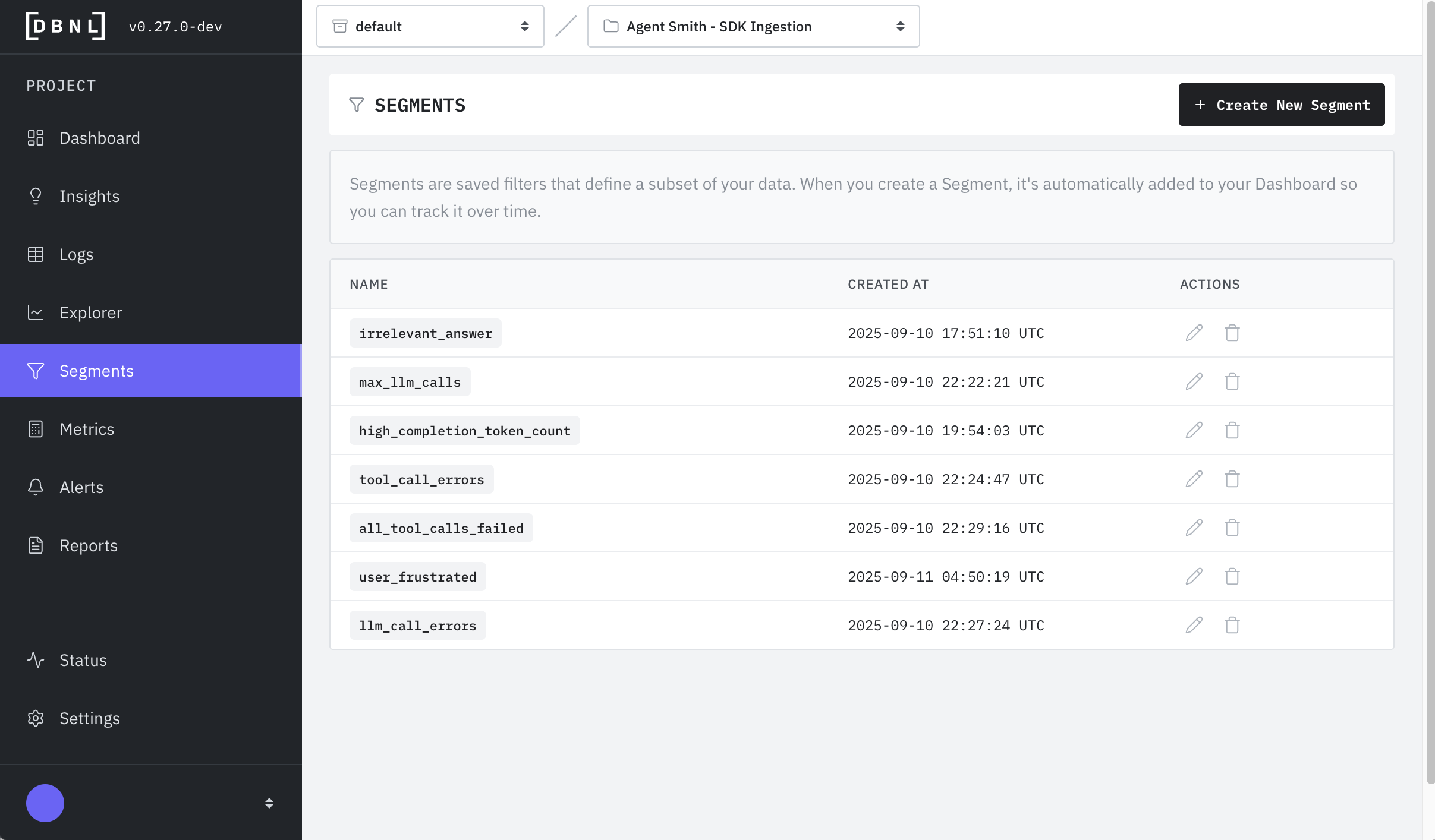 Segments are saved filters on [Log](https://docs.dbnl.com/workflow/logs) data corresponding to a specific behavioral signal discovered manually or from an [Insight](https://docs.dbnl.com/workflow/insights).